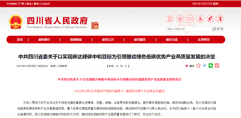12月8日,中共四川省人民政府在官網(wǎng)發(fā)布了《中共四川省委關(guān)于以實(shí)現(xiàn)碳達(dá)峰碳中和目標(biāo)為引領(lǐng)推動綠色低碳優(yōu)勢產(chǎn)業(yè)高質(zhì)量發(fā)展的決定》(以下簡稱《方案》)。