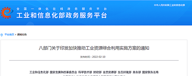 地大熱能地?zé)?多能互補網(wǎng)訊:2月10日,工業(yè)和信息化部、國家發(fā)展和改革委員會、科學(xué)技術(shù)部、財政部、自然資源部、生態(tài)環(huán)境部、商務(wù)部、國家稅務(wù)總局等八部門聯(lián)合印發(fā)了《關(guān)于印發(fā)加快推動工業(yè)資源綜合利用實施方案的通知》(下文簡稱《通知》)。